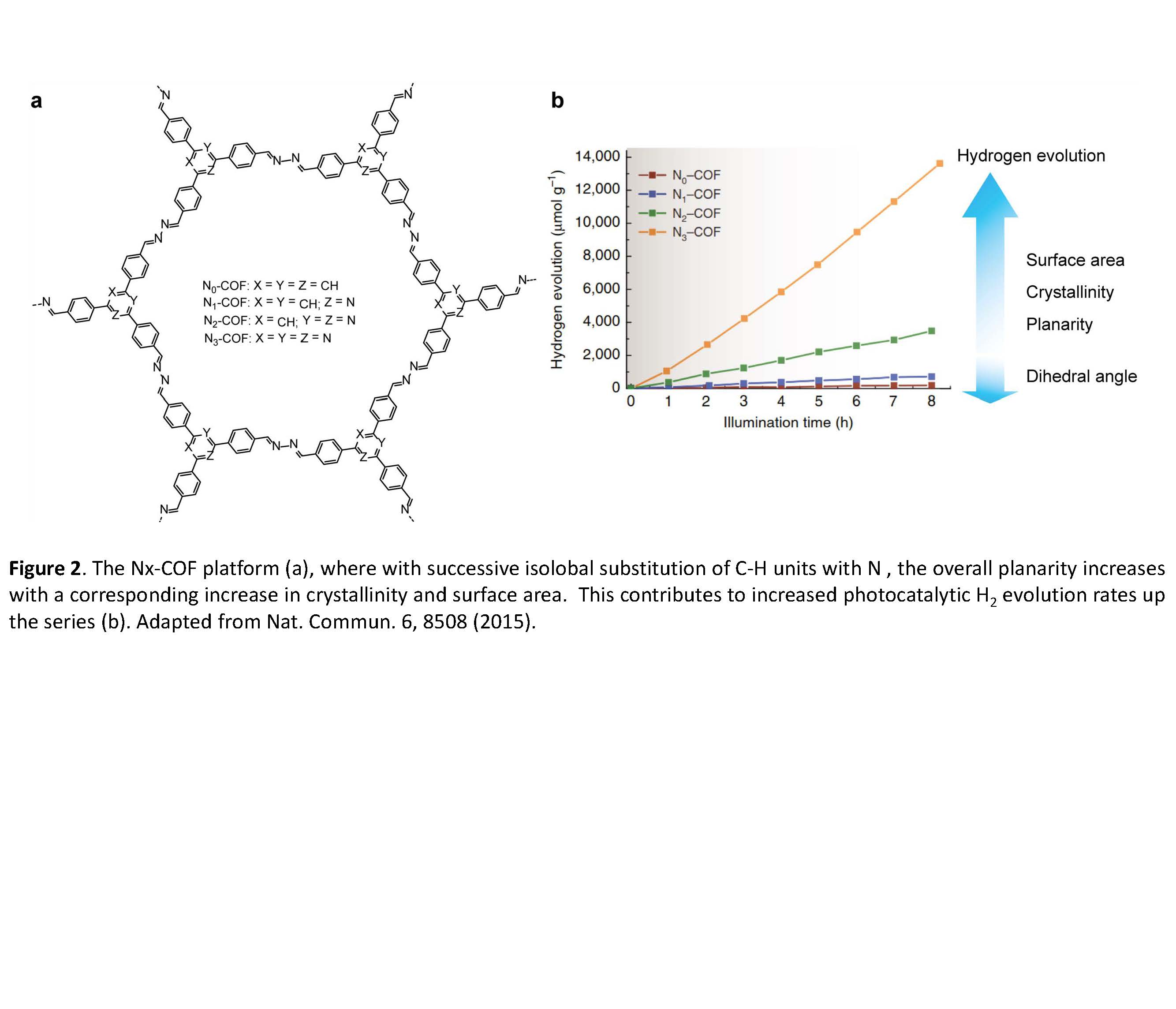 We have demonstrated that the photocatalytic activity of a COF can be tuned via an activity determining descriptor at the molecular level. For example, we have shown that the gradual substitution of the aromatic C–H units with N atoms in the central aryl ring of a series of azine-linked Nx-COFs (Nat. Commun. 6, 8508 (2015)) decreases the dihedral angle of the triaryl building block, which increases the planarity of the individual 2D COF layers, leading to higher crystallinity and surface area with increasing N content. This gradual change in structural properties leads to a 4-fold increase in the photocatalytic hydrogen evolution rate with each isolobal N substitution. High-level quantum chemical calculations of large COF model systems turned out to be instrumental in carving out and interpreting mechanistic details in these systems.