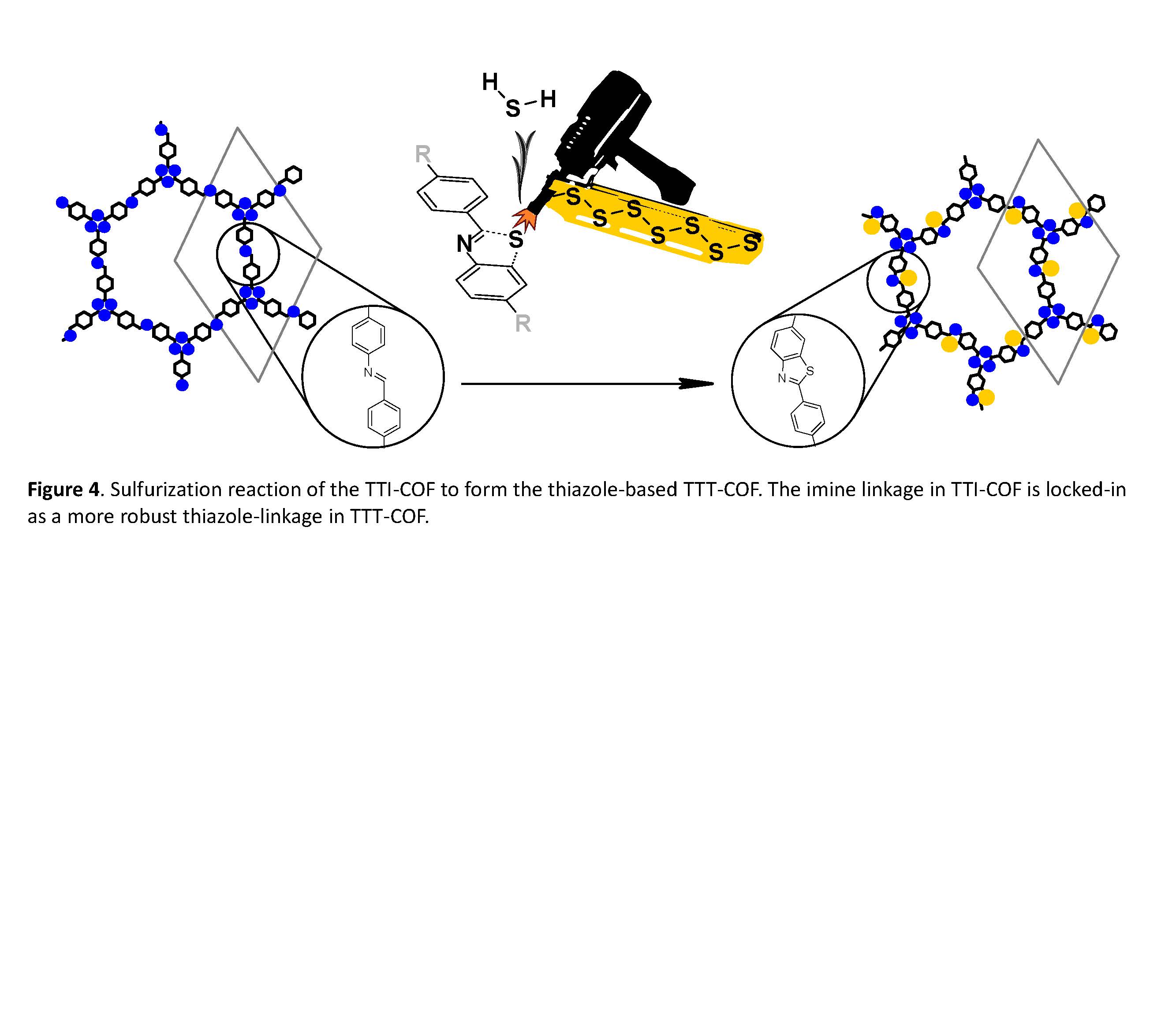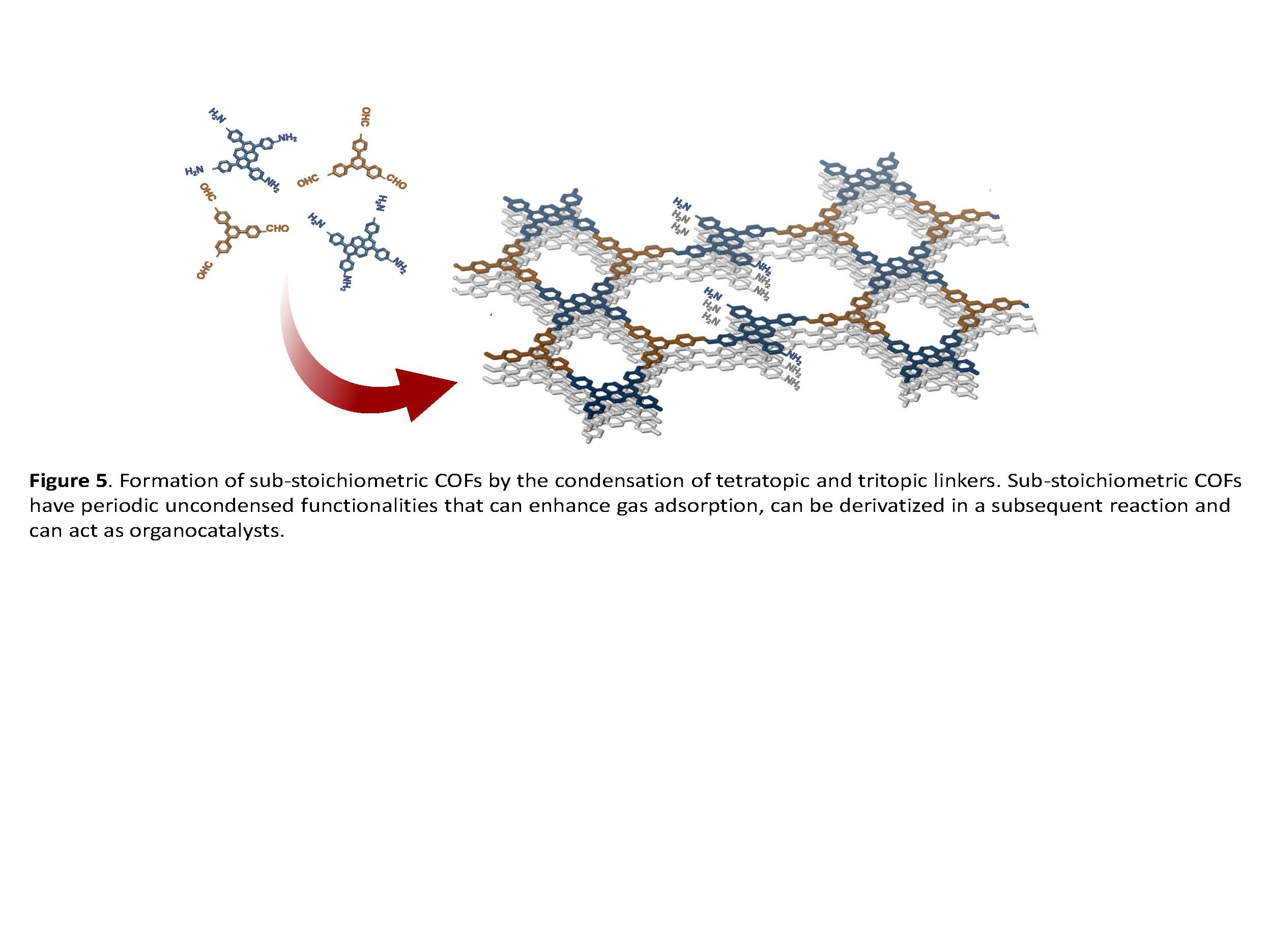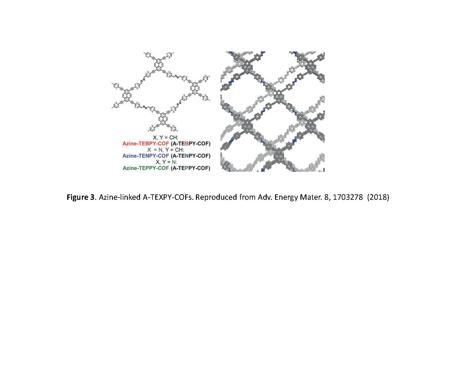 A primary goal of this project was the development of COFs that can withstand the often harsh photocatalytic conditions. Our research has led to the development of several such platforms. These include the azine-linked Nx-COFs (Nat. Commun. 6, 8508 (2015), Faraday Discuss. 201, 247 (2017)), the A-TEXPY-COFs containing pyrene building blocks for enhanced light harvesting and photo(electro)catalysis (Adv. Energy Mater. 8, 1703278 (2018)), and thiazolothiazole containing imine-linked TpTDz-COF based on the inert keto-enamine linkage (J. Am. Chem. Soc. 141, 11082 (2019)). We have further developed a post-synthetic stabilization strategy for “locking” imine-linked COFs, where the labile imine linkage is converted to a robust and conjugated thiazole linkage (Nat. Commun. 9, 2600 (2018)). We have also developed an ionothermal methodology for the synthesis of stable imide-linked COFs that are not easily accessible using standard solvothermal conditions (Angew. Chem. Int. Ed. 59, 15750 (2020)). In our search for new types of COF platforms amenable to post-synthetic functionalization, we have discovered sub-stoichiometric COFs which contain periodic uncondensed functional groups (Nat. Commun. 10, 2689 (2019)).