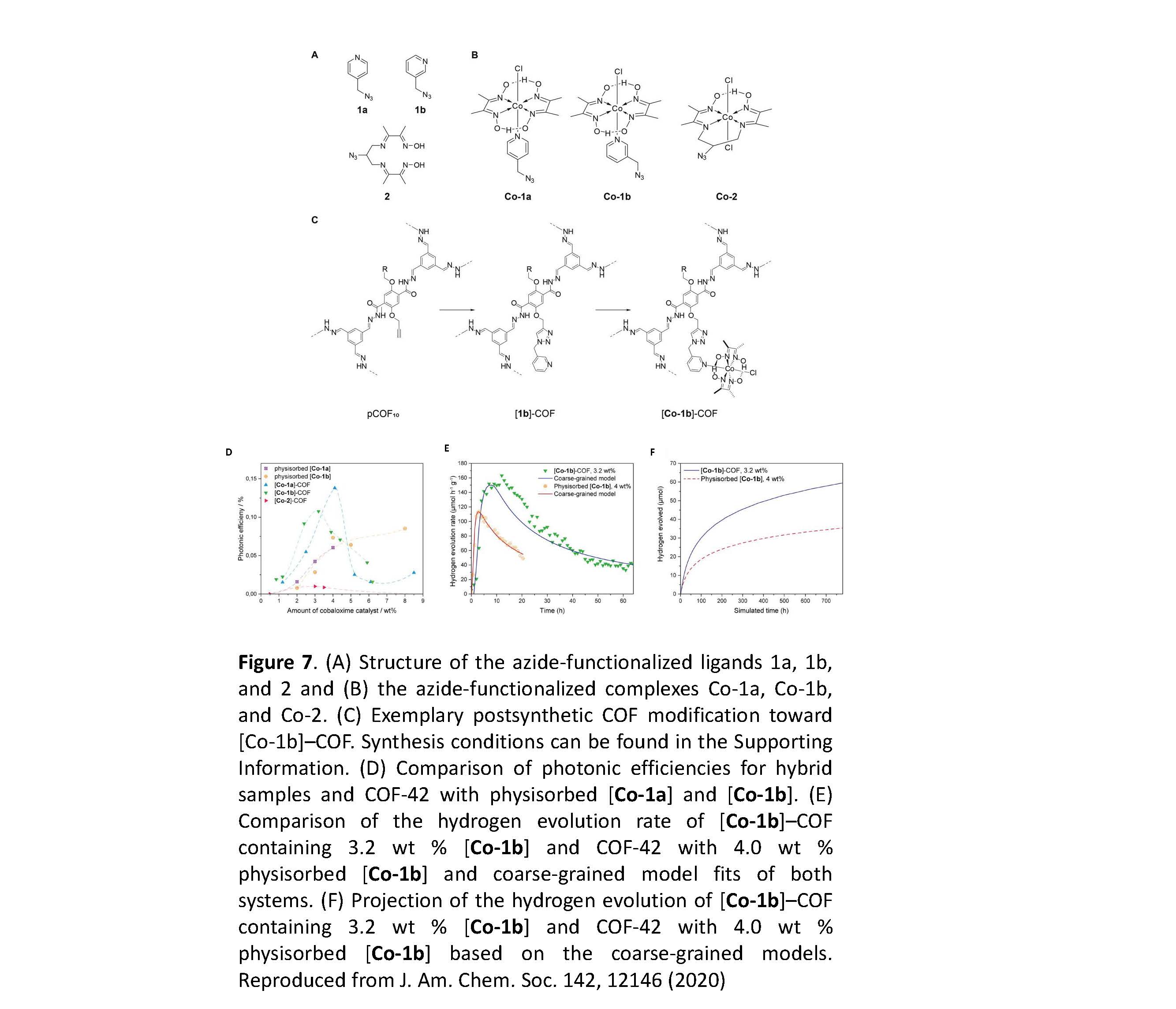 We developed the first all-single-site COF photocatalyst based on the COF—cobaloxime system for proton reduction (J. Am. Chem. Soc. 139, 16228 (2017)) and further refined this concept by devising a photocatalytic system that works under aqueous conditions with high stability (J. Am. Chem. Soc. 141, 11082 (2019)). In order to further improve the efficiency of charge transfer, we have developed a covalently linked COF—molecular co-catalyst assembly. This system is photocatalytically more active and shows extended long-term stability over the corresponding physisorbed mixture, suggesting improved charge transfer and confinement effects to be at play (J. Am. Chem. Soc. 142, 12146 (2020)).