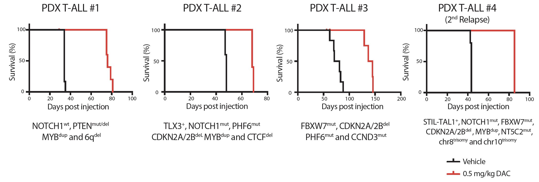 In this project, we compared DNA methylation profiles from a large cohort of human T-cell acute lymphoblastic leukemia (T-ALL) patients with a large series of normal T cell counterparts (Figure 1). Notably, we showed that CpG island methylation in human T-ALL mainly occurs at promoters of Polycomb Repressor Complex 2 (PRC2) target genes that are not expressed in normal or malignant T-cells and which display a reciprocal association with H3K27me3 binding. In addition, we revealed that this aberrant methylation profile shows a strong correlation with the epigenetic age of the leukemic T cells and elucidate that a similar CpG island methylation signature is gradually established in aging pre-leukemic thymocytes obtained from the CD2-Lmo2 transgenic T-ALL mouse model. Finally, we unexpectedly uncovered that this age-related CpG island hypermethylation signature in T-ALL is completely resistant to the FDA-approved hypomethylating agent Decitabine, a drug currently used in the clinic for other hematological malignancies. However, decitabine shows uniform anti-leukemics effect in preclinical models of human T-ALL, suggesting that DNA hypomethylating agents could serve as a uniform novel therapeutic strategy for the treatment of human T-ALL bot at diagnosis as well as relapse (Figure 2).