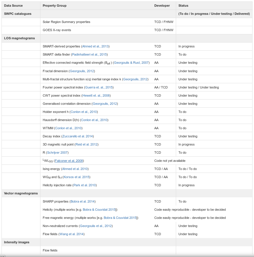 WP2 (solar active region properties as predictors of flare activity) was the first to be finalized, because the prediction DB was a prerequisite for the prediction and verification DBs to be filled. WP2 gave rise to two of its three deliverables, with the latest one (D2.4) referring to the finalized predictor algorithms, metadata and documentation. The project produced a total of 171 predictors for each SHARP analyzed.