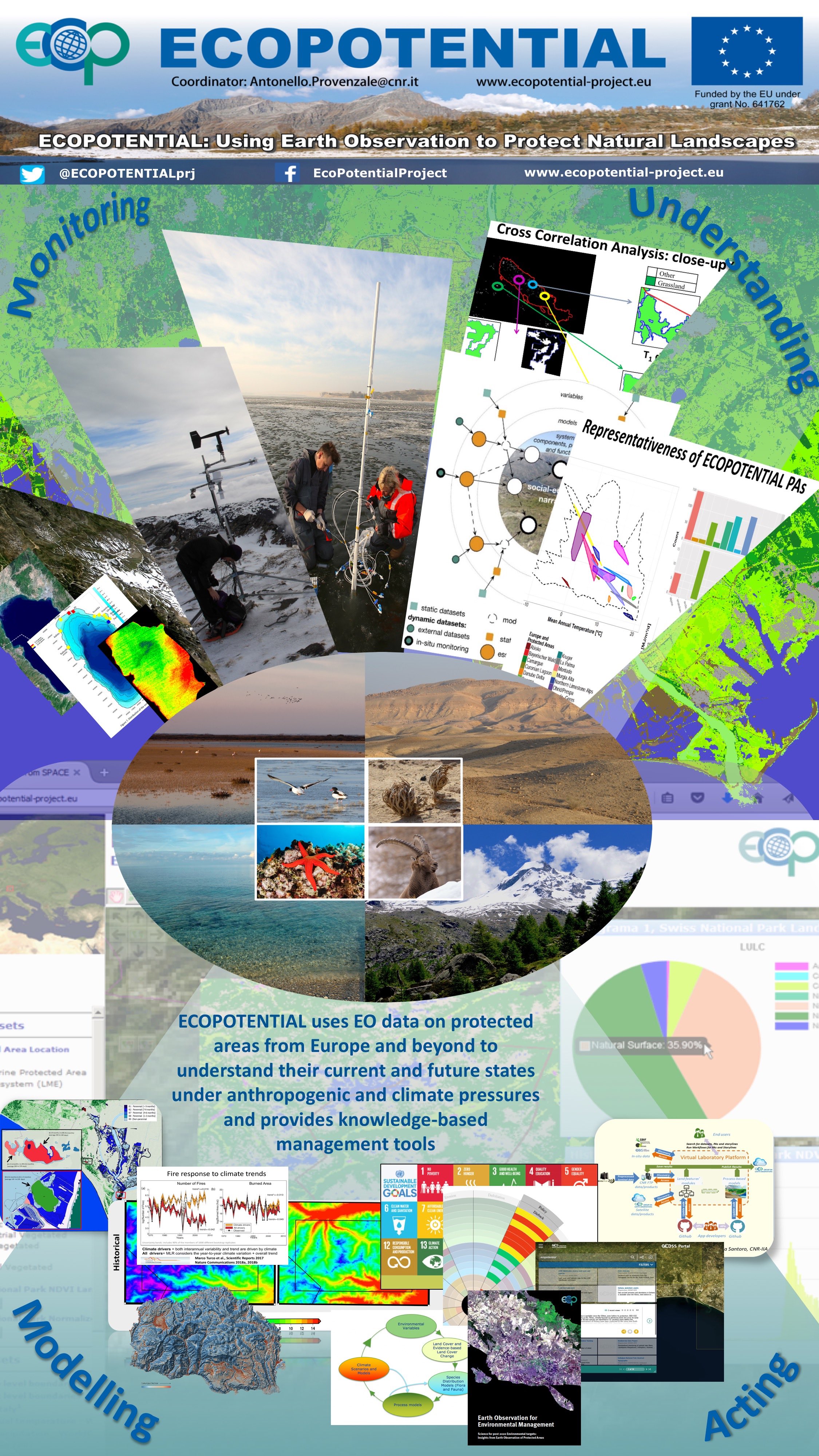 (12) sharing of the created knowledge by means an array of tools: products and publications are available on open access repositories as Zenodo (https://zenodo.org/communities/ecopotentialh2020/?page=1&size=20(öffnet in neuem Fenster)) the GEO portal (https://www.geoportal.org/(öffnet in neuem Fenster)) and the CNR repository PUMALab (http://pumalab.isti.cnr.it/index.php/it/eu-h2020-project-ecopotential(öffnet in neuem Fenster)) or through the ECOPOTENTIAL website (www.ecopotential-project.eu). The models and the EODESM system are also available through a virtual laboratory (Vlab) implemented at https://vl.geodab.org(öffnet in neuem Fenster) and that will be the basis for further development in EU RIs such as LifeWatch ERIC.