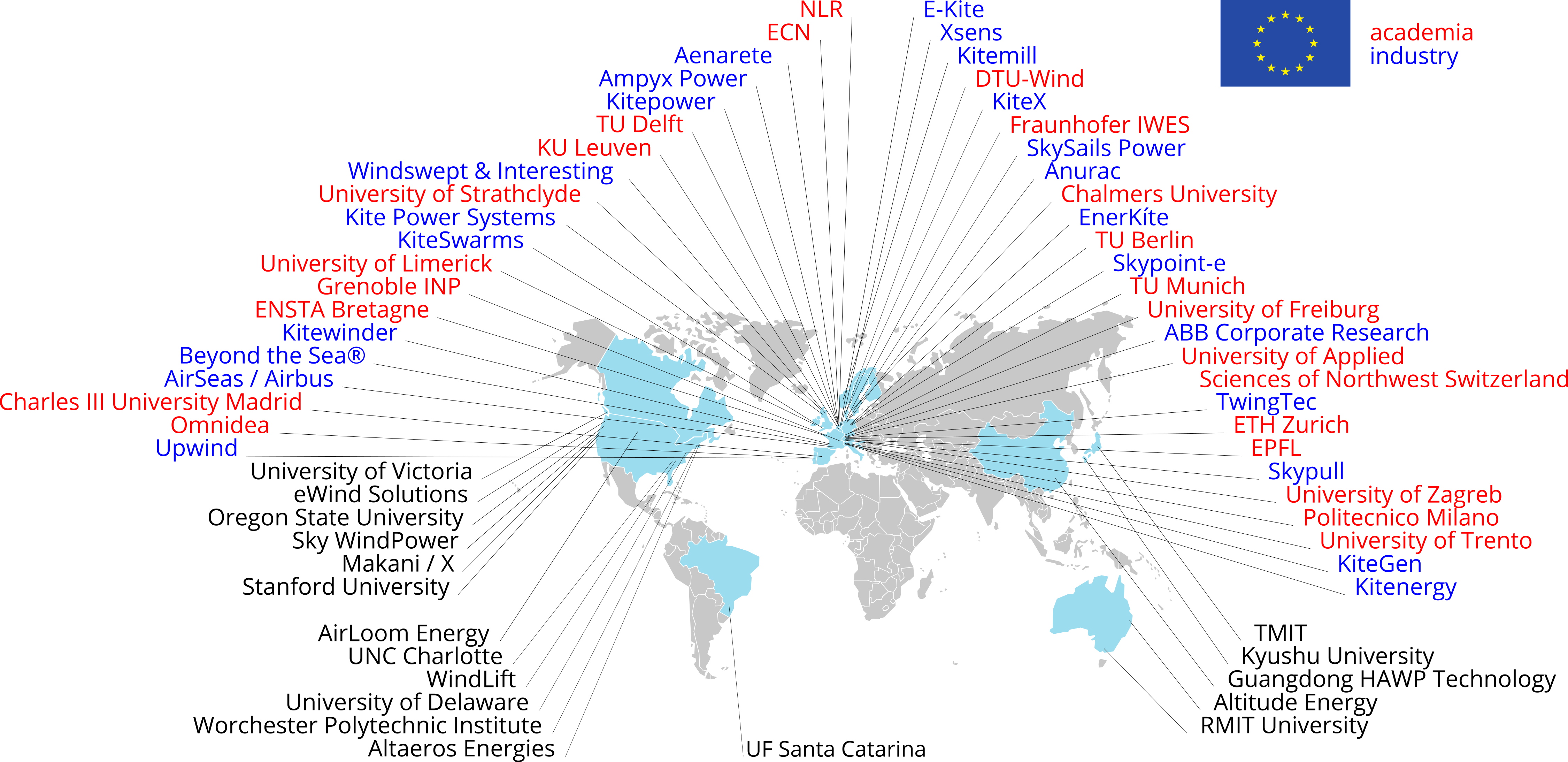 Addressing these challenges was the shared objective of the doctoral training network AWESCO (Airborne Wind Energy System Modelling, Control and Optimisation), which was launched in January 2015 and was funded by the European Union’s Horizon 2020 research and innovation programme under the Marie Skłodowska-Curie grant agreement No. 642682. The network aimed at (1) training a new generation of world class AWE researchers highly valuable to the industry, (2) expanding the training, scientific and technical knowledge base for AWE, and (3) establishing the framework for long-term cooperation between universities and industry. Technical and scientific breakthroughs were expected for (1) modelling and computational simulation of flexible as well as rigid wing systems, (2) system design and optimisation of reliable launching, power generation and landing operation, and (3) developing new sensors, estimation and control algorithms. At finalisation of the project, the AWESCO consortium consisted of 6 academic and 3 industry beneficiaries as well as 2 fully-integrated Swiss partners with own national funding. In total 16 Early Stage Researchers (ESR) worked on 4 ambitious work packages that were aligned with the technical and scientific aims of the project. The AWESCO consortium was complemented by 9 partner organisations. Actively involved in AWE, these had joined the training network to provide secondment opportunities for ESRs, but also to send own staff or researchers to the AWESCO network trainings.