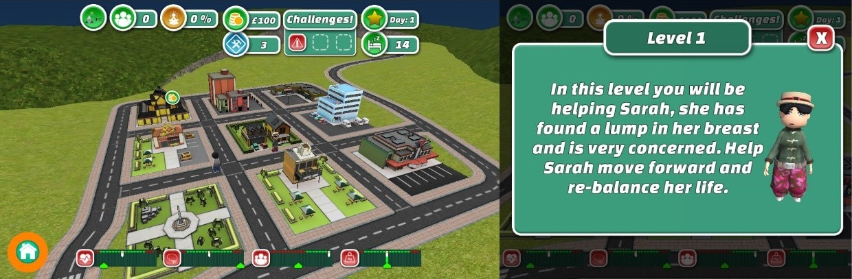 The Serious Game for Adults promotes a healthier lifestyle, disease management and encourages patients to manage their disease. The game puts the users in the role of an authority figure who manages a town, trying to balance residents’ resources and time to face cancer related lifestyle problems.