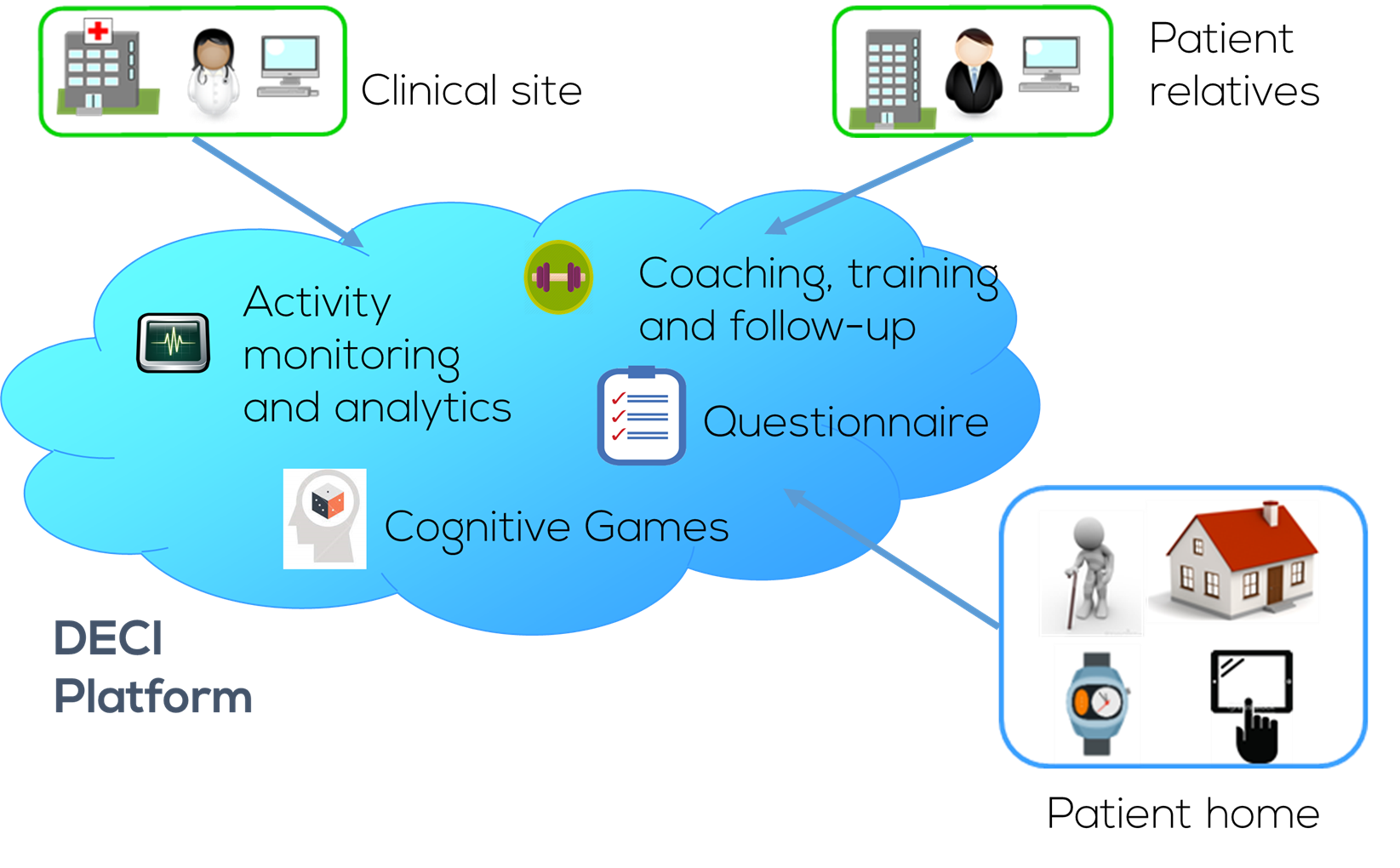 2. The Service and Organizational model (see DECI organizational model) that includes a remote monitoring of patients’ physical activities and of the adherence to cognitive and physical exercises and a continuous communication among clinicians and patients/caregivers. This is provided within a new organizational model that includes a Case Manager who follows the patient during his/her overall care path and accesses the DECI system. In Sweden, there is an additional innovation: the DECI mobile team consists of a multidisciplinary team visiting patient’s home.
