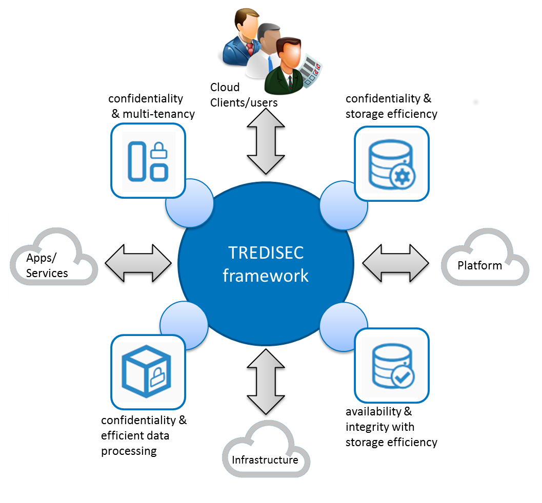 In TREDISEC, we designed security primitives that not only ensure data protection and user privacy but also maintain the cost effectiveness of cloud systems. First, we identified the functional and non-functional requirements that are crucial to the cloud business. We further analysed the conflicts between these requirements and security needs and developed new solutions that address these shortcomings and enhance security. Moreover, we provided a framework that helps cloud providers integrating these solutions seamlessly into their existing infrastructure and services, facilitating adoption by existing EU businesses.