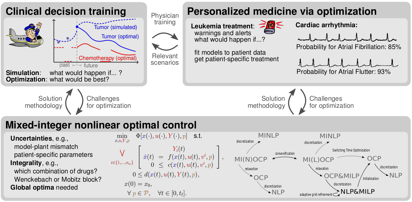 Optimization algorithms have been developed, implemented and applied to clinical decision making tasks. Results on optimal timing of measurements, sensitivities of white blood cell count dynamics with respect to timing and dosage of chemotherapies, optimal treatments for Acute Myeloid Leukemia in adults, simulated treatments for Acute Lymphoblastic Leukemia in children, optimal phlebotomy schedules for Polycythemia vera patiens, and on optimized measurement procedures during catheter ablation were obtained. For the application of Acute Myeloid Leukemia a novel dynamic stratification of patients was discovered. For the application of cardiac arrhythmia diagnostics the accuracy of our algorithms could be further increased by development of an innovative and interpretable combination of mathematical optimization and machine learning.