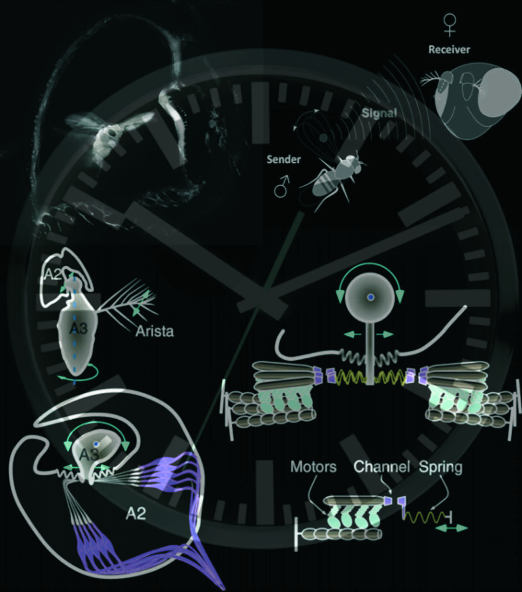 In virtually all living organisms, so called circadian clocks pick up, and repeat, the fundamental beat of life, which is caused by the earth’s daily rotation about its own axis. Circadian clocks are autonomous agents, they keep ticking away without any external stimulus and thereby create their own nights and days. In order to synchronise, or entrain, themselves to the world they are living in, however, clocks require so called Zeitgeber, i.e. sensory stimuli, which are coupled to the underlying geophysical cycle, the most prominent one here being probably the continual succession of light and darkness; but also temperature oscillations serve as Zeitgeber and can synchronise the clock. In insects, such as the fruit fly Drosophila another sensory modality has been linked to circadian entrainment, namely mechanosensory pathways. In this project, we dedicate attention to the interface between insect mechanosensors and the circadian clock. We ask: How do mechanosensory systems affect the clock? And: How does the clock affect mechanosensory systems? We ask these questions with a focus on one specific mechanosensory system: hearing and acoustic communication (in fruit flies and disease-transmitting mosquitoes).