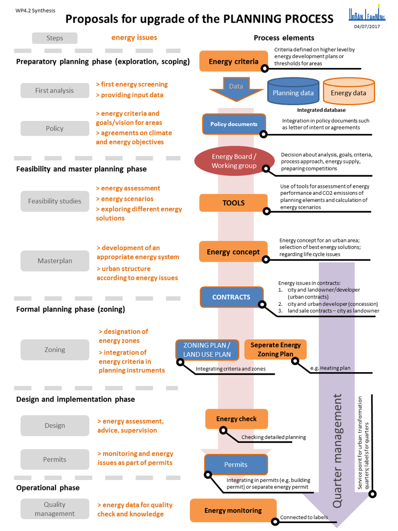 At the beginning all cities thoroughly analysed the current situation. They identified how energy qualities are currently addressed in the urban planning of quarters. A key tool for the analyses were process flow charts, developed for all cities. In addition, a detailed mapping of related instruments and tools was carried out. In total, over 170 instruments and tools were identified. Due to the high number, the analysis concentrated on the most relevant 22 instruments and 22 tools. To understand better which low-carbon options are most suitable and which planning implication they have, existing lighthouse areas were assessed, supported by study tours to receive first-hand experience.