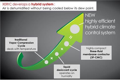 In XERIC we have worked to exploit technologically the properties of aqueous solutions of desiccants housed in a novel three-fluids-combined-membrane-contactor (3F-CMC) that simultaneously works with air, desiccant solution, and refrigerant. The idea is to develop a hybrid system in which air can be dehumidified without the need to be cooled below its dew-point; therefore, the overall system efficiency increases.