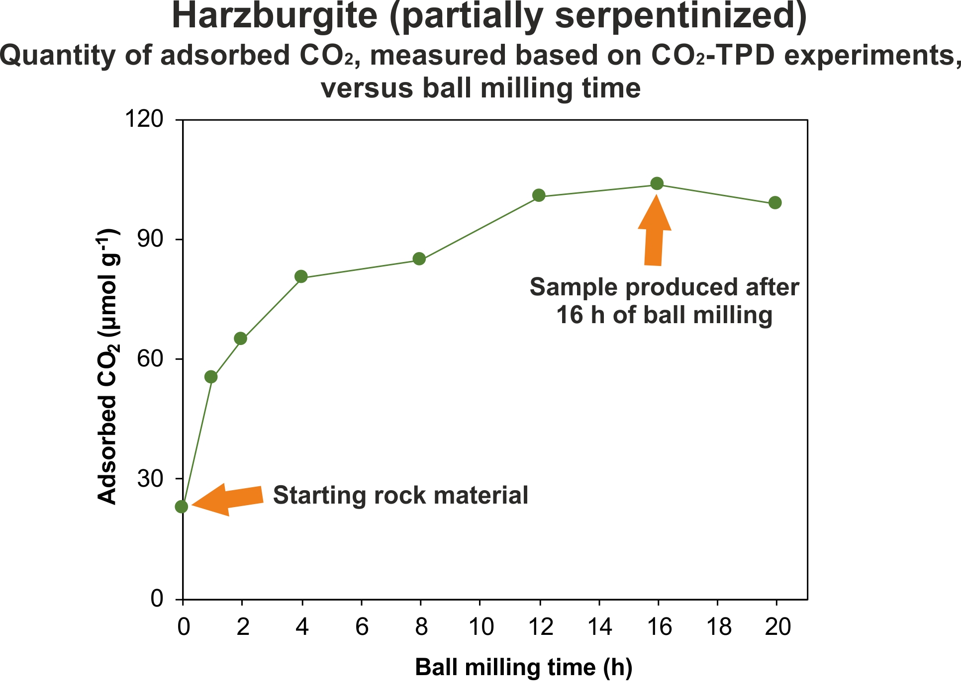 • The ball milling process substantially enhances the CO2 uptake of ophiolitic rocks (e.g. see Fig. 1).