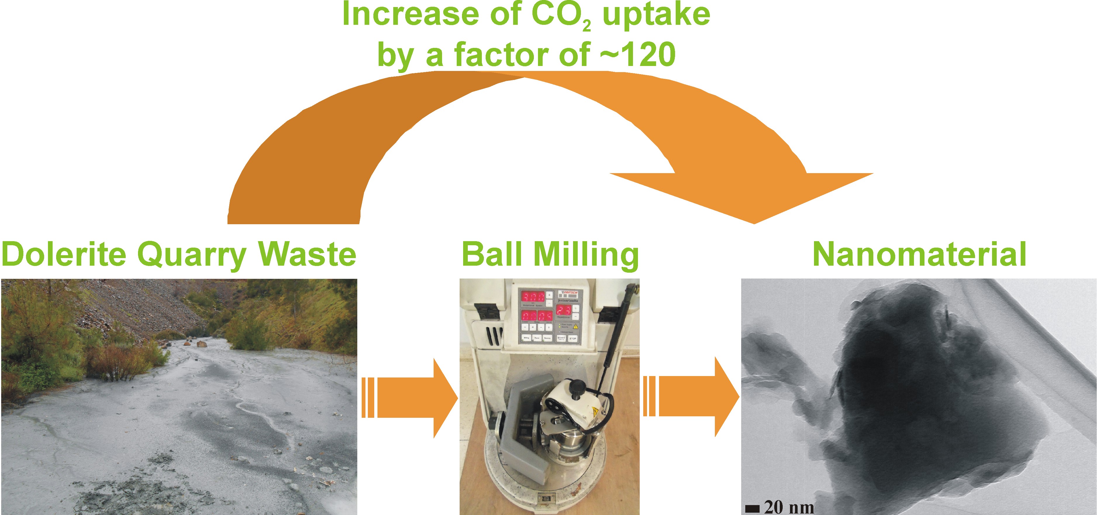 • The experimental results show that the CO2 uptake of waste materials from dolerite quarries can be substantially enhanced after ball milling, thus these materials can be potentially used as feedstock for the ex situ mineralization of CO2 (see Fig. 2).