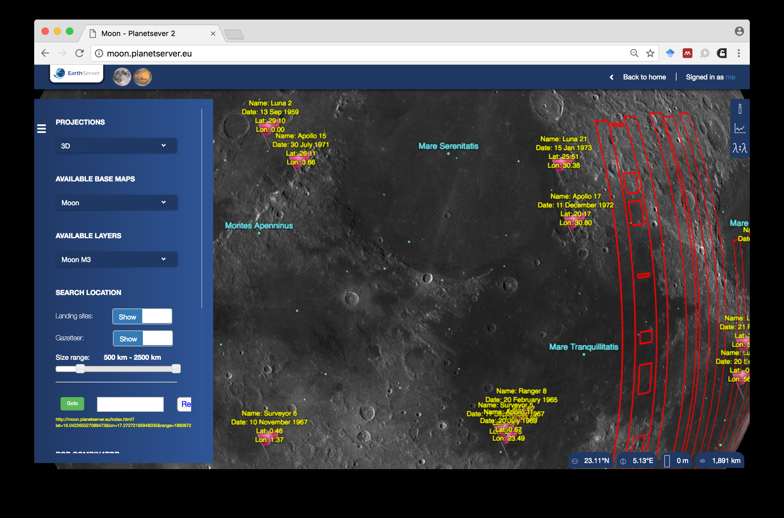 Immersive 3d visualization powered by NASA World Wind is now the standard web client delivery method for all partners, with a streamelined, consistent User Interface across the project, yet allowing for discipline-specific features (such as analytical tools, plotting and overall maps and data served, e.g. Solar System bodies for the Planetary Service - http://planetserver.eu/(s’ouvre dans une nouvelle fenêtre)).