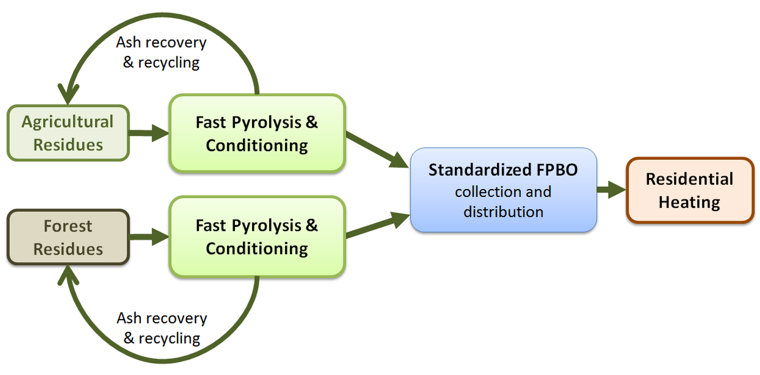 The overall objective of the project, Residue2Heat is to enable the utilization of various biomass residue streams in residential heating applications in a sustainable manner. For this, a two-step approach is followed in which biomass residue streams are first converted into a uniform, second generation liquid biofuel via fast pyrolysis called fast pyrolysis bio oil (FPBO). Secondly, existing residential heating systems are tailored and optimized to allow the use of FBPO. (See Figure Overall Objective).