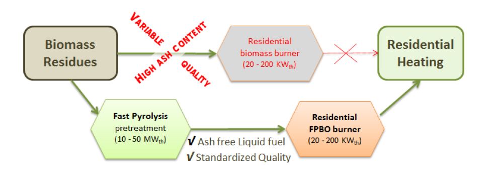 The main outcome of the EU H2020 project Residue2Heat is the development of stand-alone, small scale residential boilers (20-60 kWth) fuelled with fast pyrolysis bio-oil (FPBO). Further achievements include the production of high quality FPBO from high ash biomass residues, atomization and combustion of FPBO, design and manufacturing of modified burner components and a logistics plan for storage and handling. The novel FPBO fuelled boiler is meeting most operational and environmental demands in the actual intended environment (TRL5).