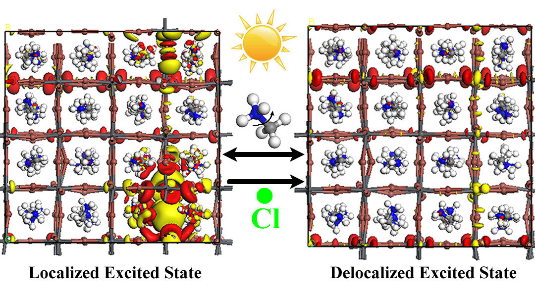 (iii) The state-of-the-art progress suggests the perovskites with formamidinium (FA) cations reach power conversion efficiency exceeding 20%. However, the picture that the dipolar nature of the MA cations heals the defects in MAPbI3 seems invalid in FA-based perovskites due to the much weaker dipoles of FA cations. Meanwhile, the organic cations are reported to be not essential in the lead bromide perovskites. Hence, the puzzles pertaining to the role of organic cations in the organic-inorganic hybrid perovskites still remain. Taking advantage of the TDDFT formalism which treats electron-hole and electron-nuclei interactions on the same footing, the Fellow revealed that the spatial extent of the electronic excitations in defective lead iodide perovskites including MAPbI3 and FAPbI3 is controlled by the size of organic cations. Yet, the role of organic cations is largely weakened as the inorganic lattices shrink, yielding rather similar primary photoexcitations in MAPbBr3 and FAPbBr3 perovskites. These different excited-state properties are ascribed to the varied rigidity in these perovskites.