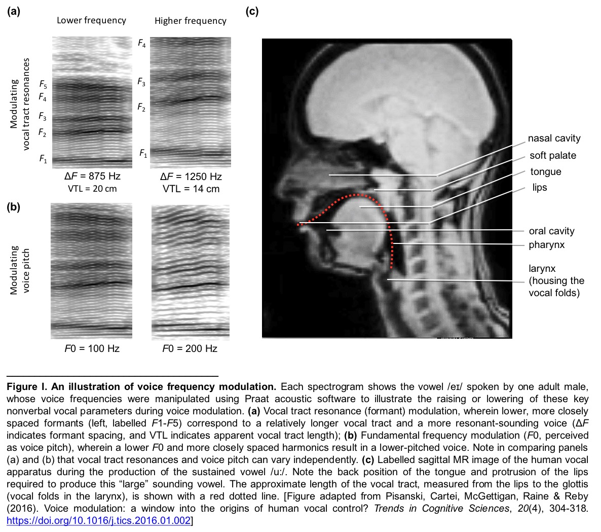 Our results show that voice modulation, while rare in other animals, is commonly and cross-culturally observed in everyday social interactions among humans. The evolutionary origins of this complex form of vocal behaviour may be closely tied to the social advantages it appears to confer. The broad dissemination of these results to both the research and lay communities has increased awareness of the extent to which nonverbal vocal parameters can influence social stereotyping, highlighting that voice modulation can be used in some contexts to exaggerate or ‘fake’ one’s traits and capabilities, with potentially significant social, political and economic impacts.