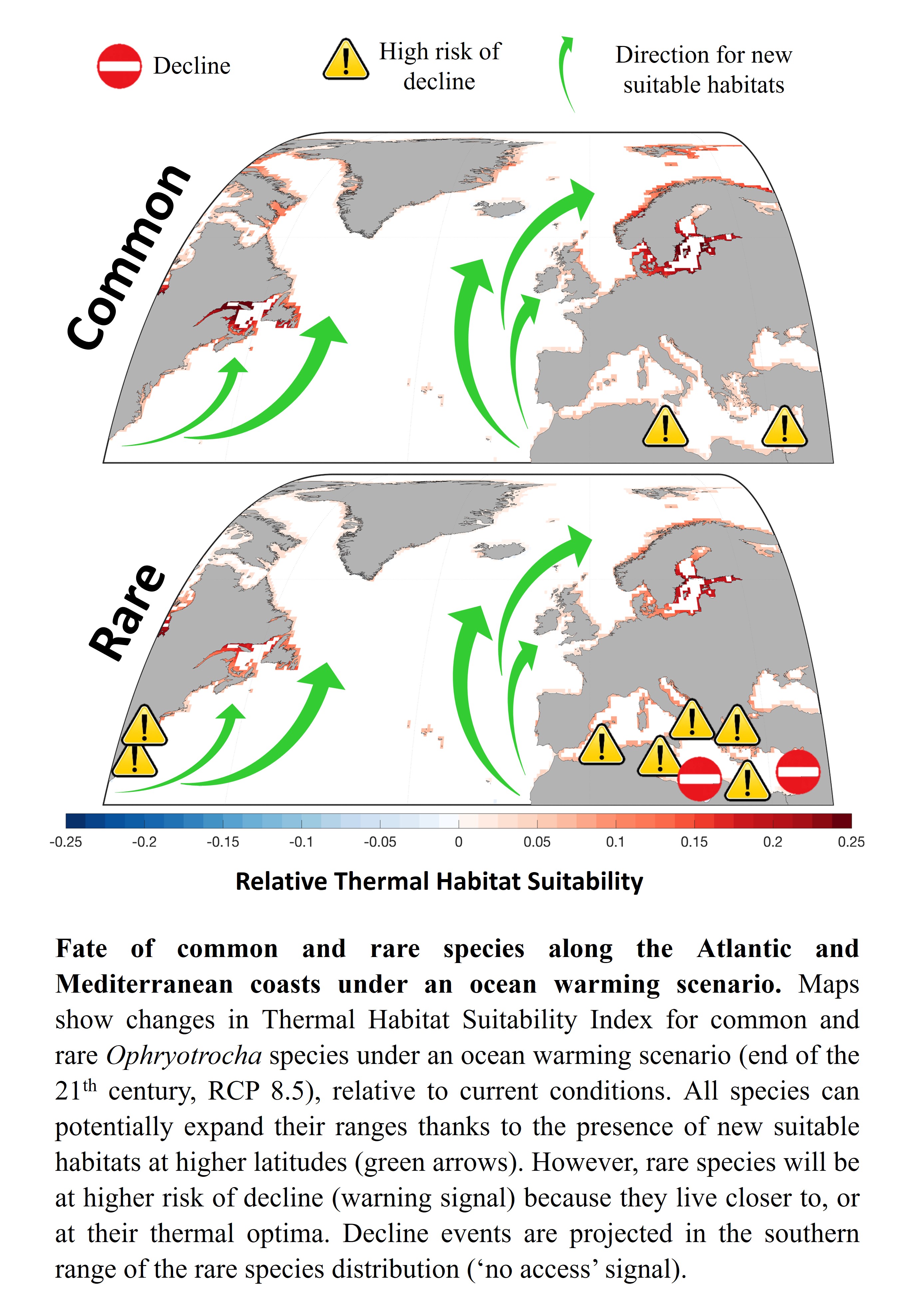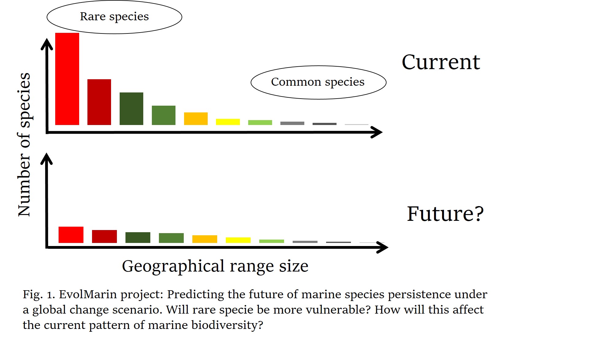 Rare species’ higher risk of decline and extinction, especially in the southern part of their distribution, is a threat to current patterns of biodiversity and to the ecosystem services they provide. Northwards migration would allow all species to track the thermal conditions more suitable for their persistence, but limited dispersal capacity or barriers to migrations may limit the search for new thermal refugia. Providing empirical evidence on the fate of marine species under a global change scenarios is of fundamental importance to make effective decisions for biodiversity conservation. The patterns shown by the EvolMarin project not only identify priority targets for decisions on biodiversity conservation, but also help predict which regions will be much more negatively impacted by ocean changes in terms of loss of biodiversity and ecosystem services.