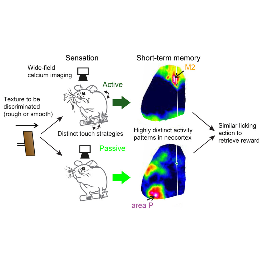 For the outgoing phase: We found multidimensional cortical dynamics involved in both sensory integration and short-term memory and also related strongly to the behavioral parameters of each mouse. Mice either deployed an active or passive strategy. Independent of strategy, whisker-related posterior areas encoded choice early after touch. During the delay, in contrast, persistent cortical activity was located medio-frontally in active trials but in a lateral posterior area in passive trials. Perturbing these areas impaired performance for the associated strategy and also provoked strategy switches. Thus, depending on behavioral strategy, cortical activity is routed differentially to hold information either frontally or posteriorly before converging to similar action.