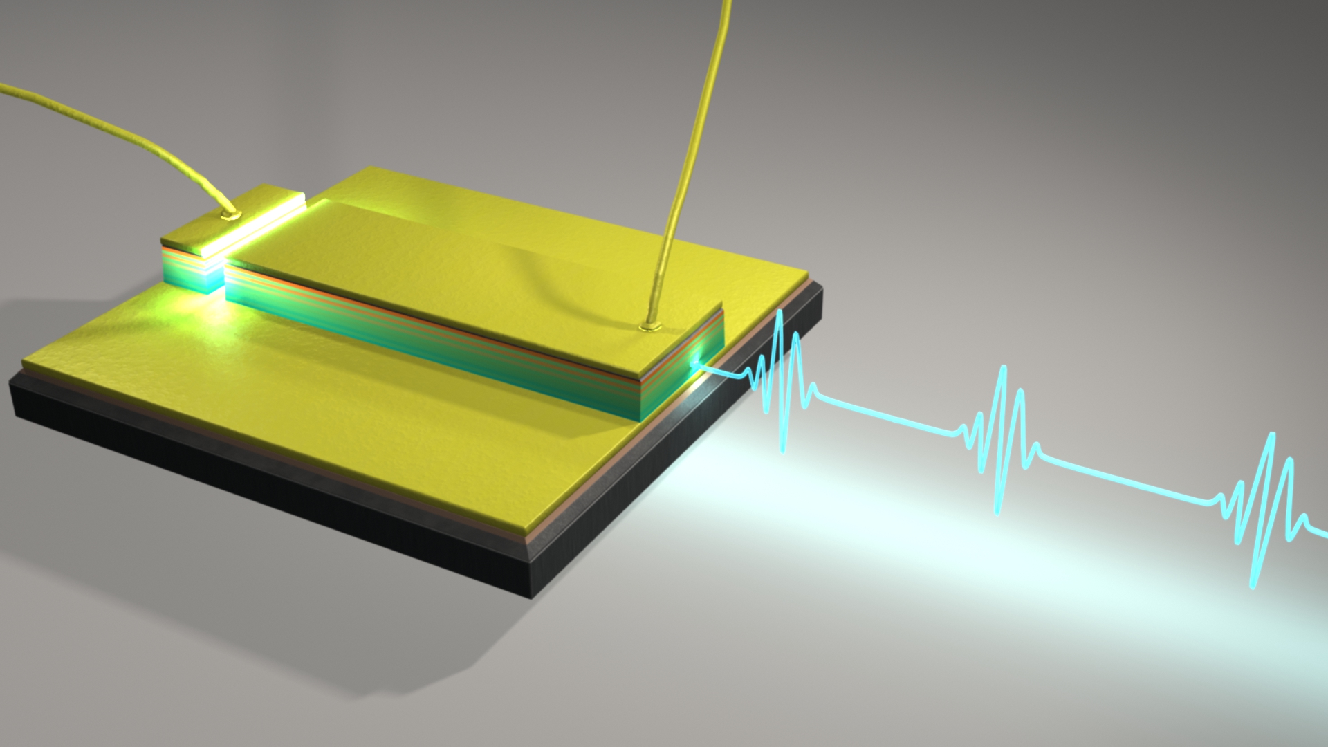 However, in the terahertz (THz) frequency range, with its proven applications in imaging, metrology, communications and non-destructive testing, a semiconductor based technology platform for intense and short pulse generation has yet to be realised. Ultrafast excitation of photoconductive switches or nonlinear crystals offer only low powers, low frequency modulation or broadband emission with little control of the spectral bandwidth.