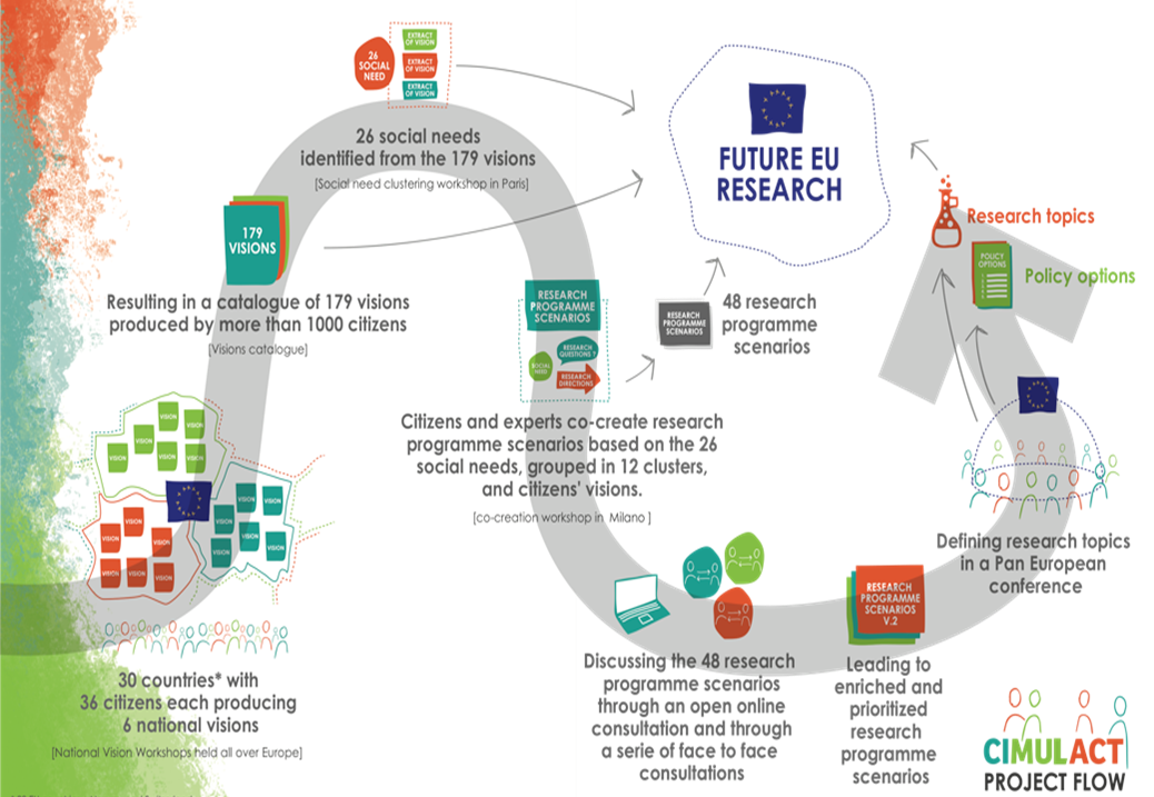 CIMULACT stands for ‘Citizen and Multi-Actor Consultation on Horizon 2020’ and was a project funded by the European Commission to engage citizens in the formulation of EU’s major Framework Programme for Research and Innovation –Horizon 2020. The project running from 2015-2018 engaged a wide range of societal actors embarking on an extensive participatory initiative, including citizens, experts, policy makers and other stakeholders from across Europe.