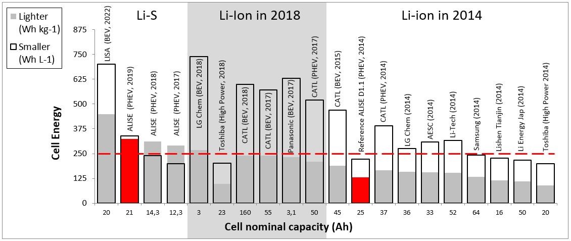 • ALISE cell demonstrators have always been lighter respect commercial stat-of-the-art and reached finally 21 Ah 325 Wh kg-1, 340 Wh L-1 at C/5, 80% of the C/5 BoL at 1C, 80% BoL and 80% DoD for 95 cycles. ALISE provides Li-S high energy density with enhanced power rate.