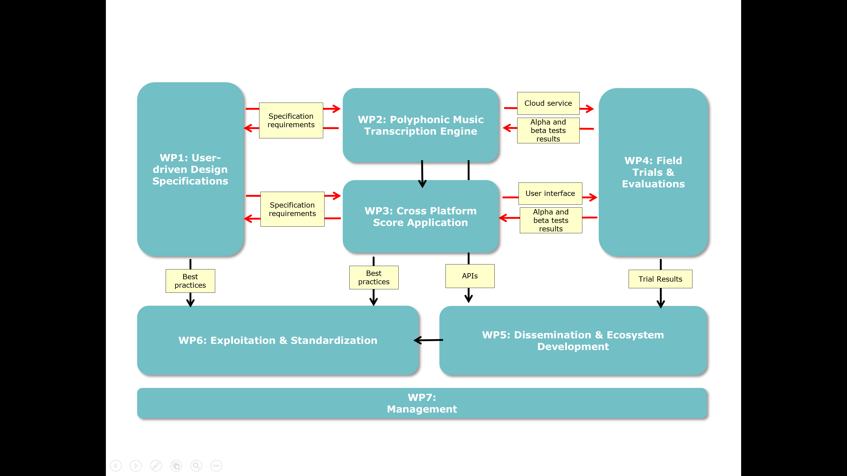 • Objective 3 (develop a vibrant ecosystem around the technology and models): the project will publish APIs and encourage third party developers to come up with their own innovative application ideas, based on the polyphonic music transcription engine.