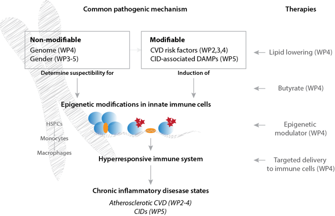 In WP4, we first identified a list of SNPs which correlated with trained immunity in monocytes in healthy volunteers. We assessed the predictive value of this ‘epigenetic’ gene risk score on CV-risk in the general population (Copenhagen General Population Study). Of the SNPs associated with trained immunity, none were convincingly associated with CVD-risk. We subsequently evaluated DNA-methylation, which is a more stable sign of epigenetic changes. We also addressed the reversibility of epigenetic remodeling by lowering of ‘traditional’ lipid risk factors in relation to inflammatory activity, assessed as plasma cytokines, immune cell phenotype of circulating cells and vascular wall inflammation. In various patient cohorts, we substantiated a multi-level pro-inflammatory state, ranging from all the way from bone-marrow, plasma immune cells to the arterial wall. In subsequent intervention studies, we were able to unravel the differential regulation of immune cell activation on various target levels. Furthermore we initiated a clinical study to address the impact of an epigenetic modulator on inflammatory activity in humans (oral methylbutyrate intake). In parallel, we conducted a clinical study to investigate the impact of the bromodomain inhibitor (RVX-208) on the inflammatory state in type 2 diabetes mellitus patients.