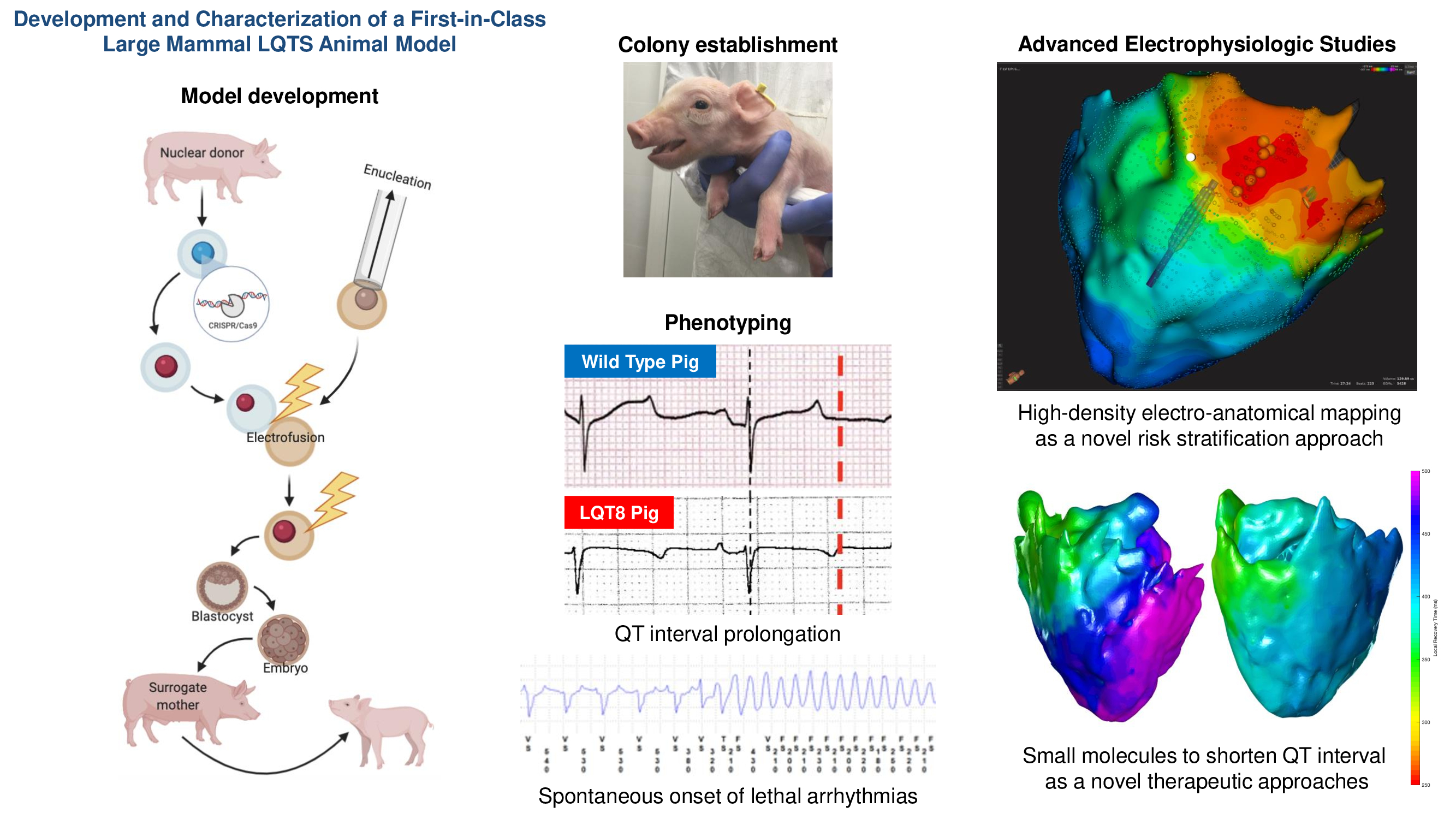 In the meantime, we have also advanced the attempt to develop a pig model of Timothy Syndrome (TS), since rodent model is often flawed with issues of anatomy and physiology, as in cardiac diseases. Yet, a pig model requires the sort of clinical assistance that is required for a human patient: thanks to the competence of our partner AVANTEA, a company with a solid background in the development of animal models for scientific biomedical research, we embarked in this effort driven by the motivation to understand mechanisms causing arrhythmias in Timothy syndrome and to develop gene therapy for the disease. The relevant mutation has been thus inserted in fibroblasts from pigs using state-of-the-art genome editing techniques; subsequently, the nucleus of fibroblasts is inserted in an oocyte of a sow (somatic cell nuclear transfer, SCNT) to create an embryo implanted in the uterus of a sow serving as a surrogate mother. The success of this part, which represents the very high-risk component of the project, has been conducted by our partner Avantea that in only 30 months has induced the first pregnancies leading to the delivery of several litters of pigs carrying the causative point mutation that causes TS.