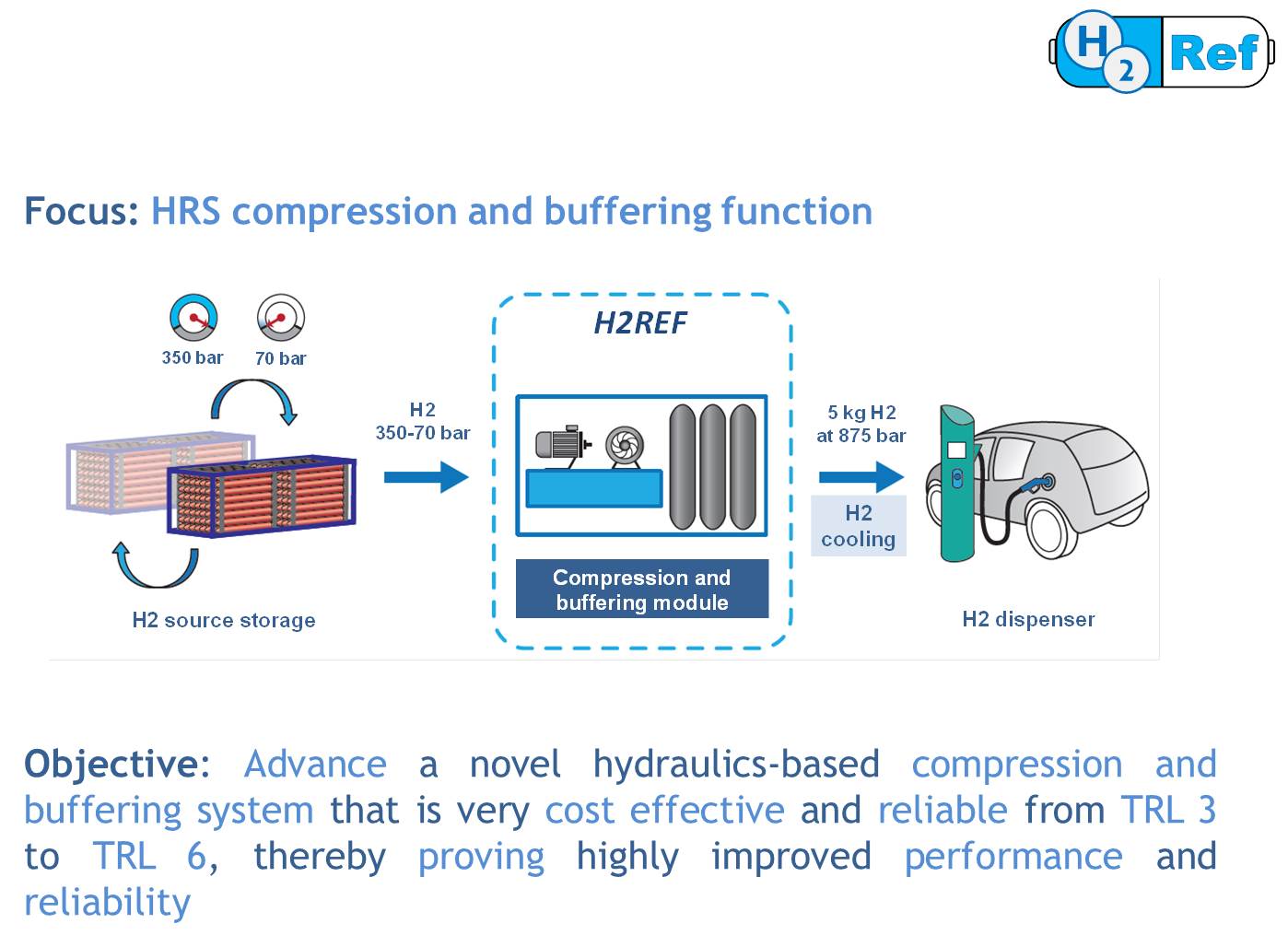 The H2REF project is an FCH JU funded project completed 31/12/2019 which addresses hydrogen compression and buffering for the refuelling of fuel cell electric light duty vehicles. It encompasses all the necessary activities for advancing a novel hydraulics-based compression and buffering system that is very cost effective and reliable from TRL3 to TRL5.