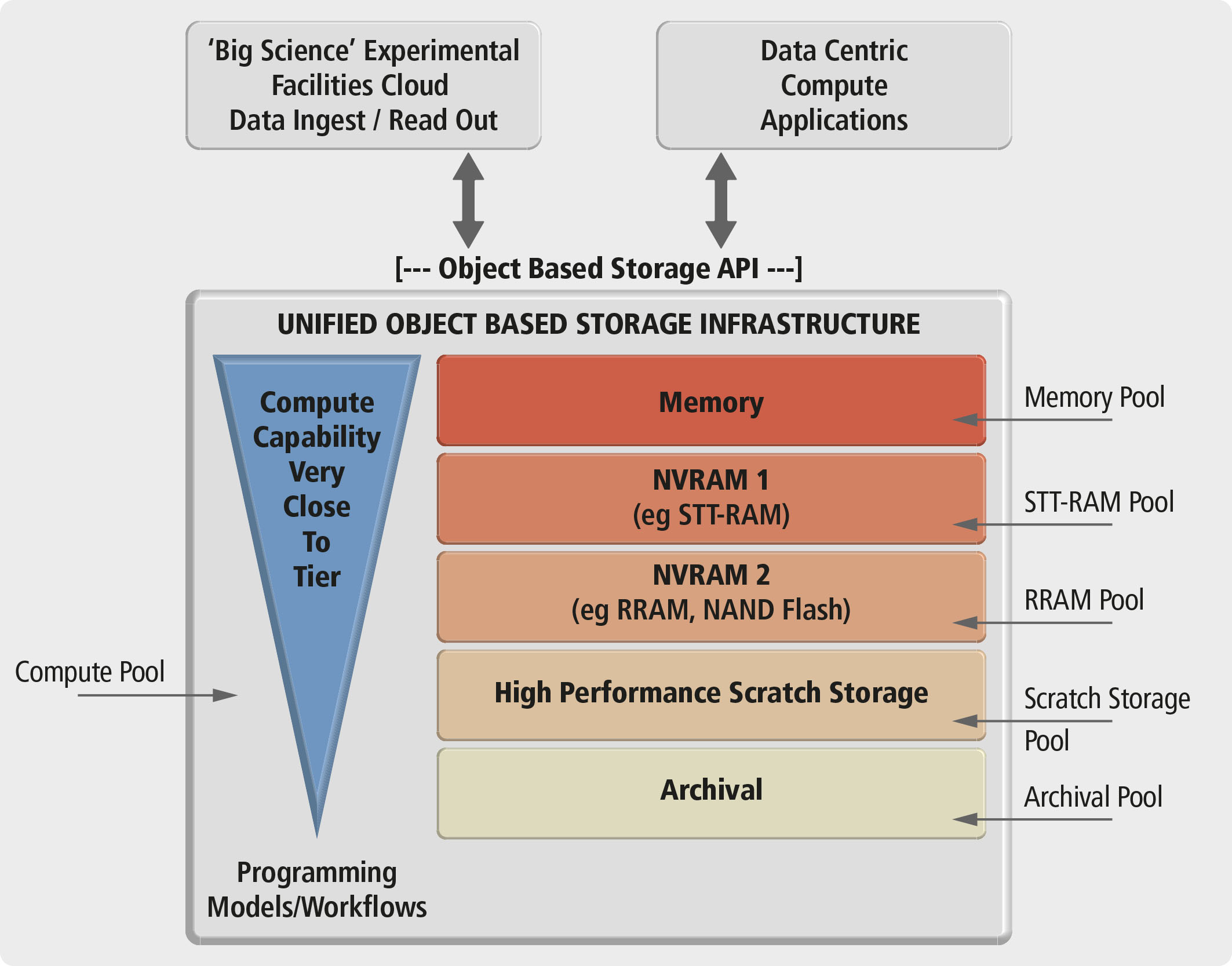 • Provide a next-generation multi-tiered object-based data storage system (hardware and enabling software) supporting current and future-generation persistent storage media, (solid-state and disc) within an I/O hierarchy . We term this “Percipient Storage”.