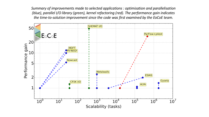For the transversal basis (WP1), an important achievement was, in collaboration with the POP Centre of Excellence, to implement a rigorous evaluation procedure for application performance. This benchmarking process gives a clear view of the application performance in several key areas (I/O, communications, memory, …) and establishes its precise status when EoCoE experts start to examine it. The impact of each code modification during the optimization process can then be seamlessly monitored and the impact of subsequent support activity quantitatively assessed. It constitutes an important asset to for pushing EoCoE applications towards exascale.