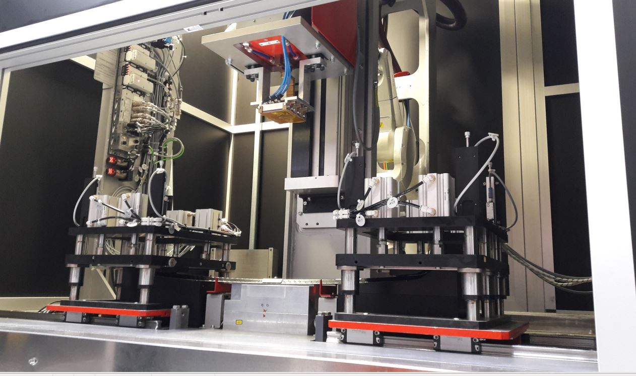 All individually developed process components were integrated into a fully automated production cell for the joining of a thermoplastic roof stiffener with 3 metal brackets (left, right, central). An articulated 6-axis robot transports the respective material component to each process step and places them in the clamping devices. Various monitoring systems were implemented in the production cell. The individual processes are monitored either with thermal monitoring systems, such as pyrometers and thermal cameras, or highly precise measuring systems, e.g. displacement sensors.