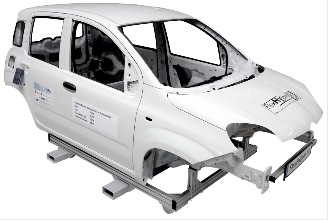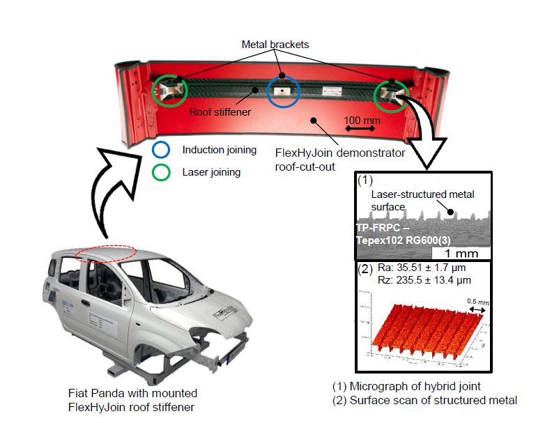 The aim of the FlexHyJoin project was to set up a fully automated production cell for joining metal with TP-FRPC for the automotive application. The validation of the developed technologies was performed with a roof stiffener for a Fiat Panda. Laser-structured metal brackets are attached to a TP-FRPC roof stiffener located behind the B-pillar to facilitate the assembly to the car body.