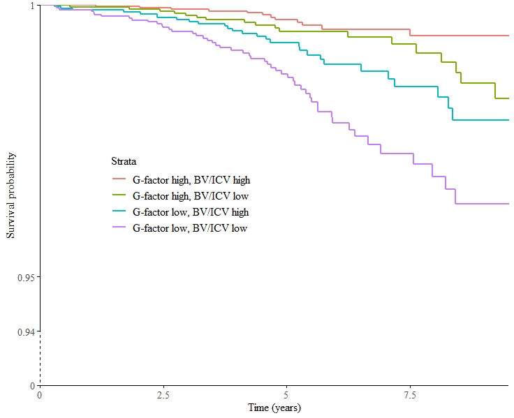 - We found a strong interaction effect between brain size and cognitive functioning, indicating that both structure and function of the brain are important aspects and show synergy in maintaining brain health (Figure 3).