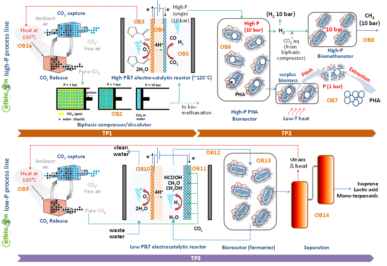 The core goal of the Celbicon project is to ultimately produce high-value chemicals with a very low, or even negative, carbon footprint. This is done by capturing CO2 from the air and converting it to complex, valuable chemicals. The CO2 is converted by a sequence of electrochemical and biochemical steps. The energy required for the conversions can ultimately come from sustainable energy sources. More specifically, three reaction lines are performed (see Fig. 1). In the first reaction line (technological platform 1, TP1), after capturing CO2 from the air, it is electrochemically converted to high pressure syn-gas (CO and H2) and the oxidation of renewable chemical in a high value acid. Then, in technological platform 2 (TP2), the syn-gas is biochemically converted at elevated pressure to building blocks for bioplastics. In this biochemical conversion some CO2 is emitted again but it is recovered, together with excess captured CO2 from air, to be then converted in a second high-pressure bio-reactor to bio-methane. In the third reaction line (technological platform 3, TP3) demineralization of wastewater is done at the same time that air-captured CO2 is electrochemically converted to formate, which is subsequently biochemically converted to large valuable compounds, such as isoprenes.