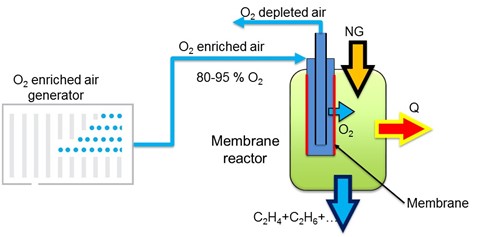 The MEMERE technology aimed towards a more efficient and flexible process for ethylene production via OCM reaction. The OCM reaction has been studied for decades though it has not yet proven economical superiority compared with conventional alternatives. In the MEMERE project the use of oxygen permeation membranes are envisaged as a key technological advancement that can increase the yield of the reactor, improving the performance of the overall process.