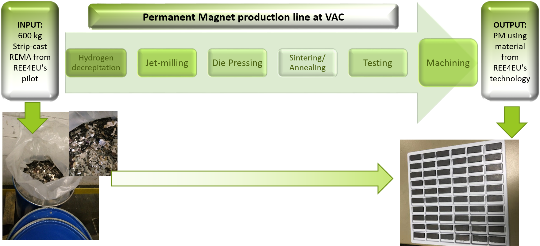 The REA obtained were used to manufacture new permanent magnets at VAC, which showed the same properties as magnets obtained from virgin material. In this way, the REE4EU project has demonstrated a closed-loop recycling process for permanent magnets at pilot scale, using RE-containing wastes available in Europe.