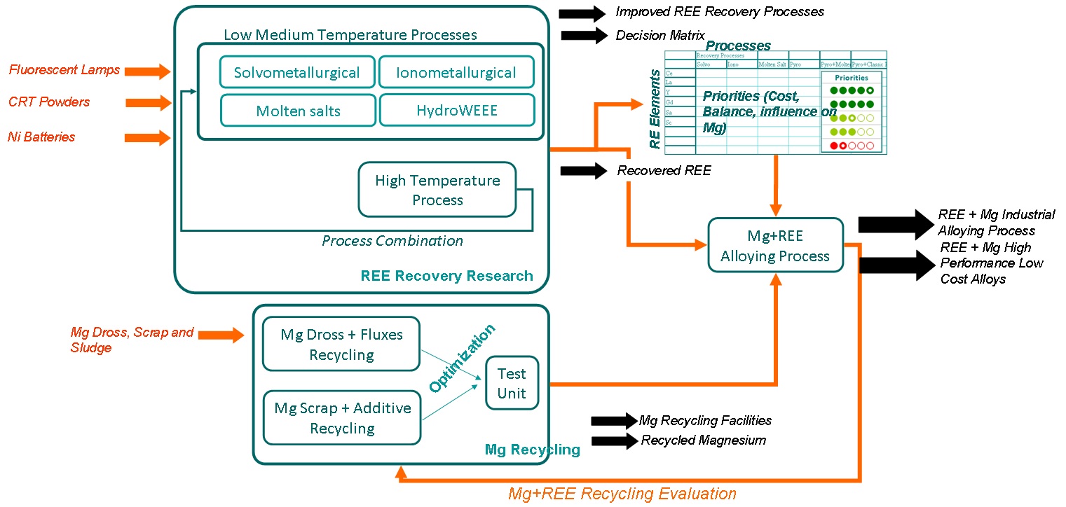 The project motivation lies on the fact that magnesium alloys can offer a significant mass reduction when compared to aluminium alloys. Weight reduction is a cross sectorial key design driver; if a superior energy absorption and vibratory behaviour is added, then magnesium becomes a promising candidate for future application. However, this entails that some of its drawbacks have to be overcome, such as its cost, manufacturability problems, corrosion and creep behaviour and low allowable service temperature. Addition of rare-earth elements (REEs) improves the performance of magnesium alloys significantly, though a price increase has to be taken into account. Remaghic believes that by investing in recovery and recycling technologies, a new alloying process can be developed to yield low cost Mg+REE alloys. Even though there are many Mg+REE alloys in the market, none of these is obtained from fully recovered/recycled raw materials. This was the main objective of the project: combining the recovery from magnesium dross and scrap to the recovery of REEs from different wastes to produce new low cost high performance Mg+REE alloys