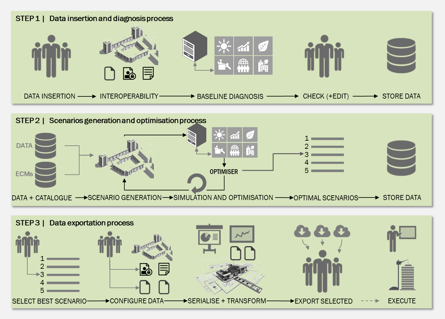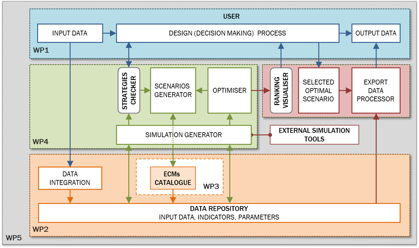 • Integration of a catalogue of Energy Conservation Measures (ECMs) considering scale of implementation and providing all needed data for the evaluation of the design alternatives.