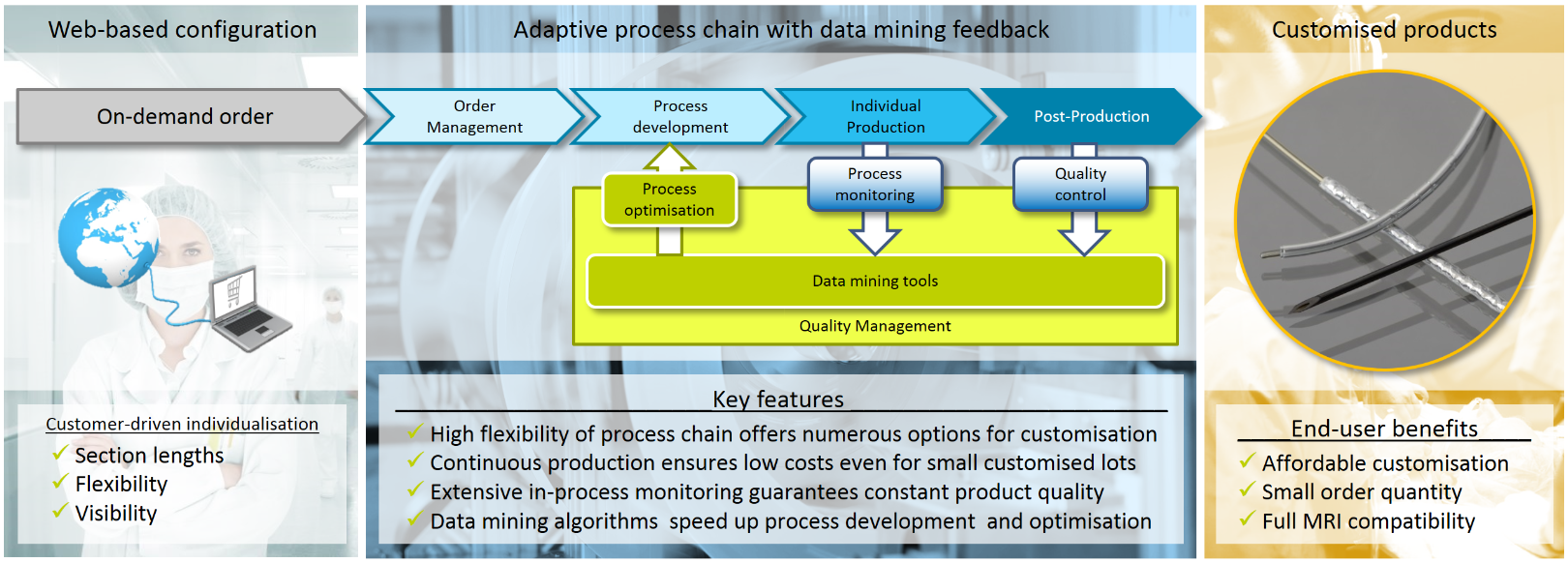 Therefore, the OPENMIND project has developed the first highly flexible process chain for the on-demand production of entirely customised minimally invasive medical devices. This process chain closes the gap between efficiently produced standard products and individually designed products, enabling even the production of small batch sizes down to single batches in a continuous, automated and fully monitored process chain. The OPENMIND project is using a guide wire as demonstrator device for showing the successful outcome of the project. The process chain was completed by a comprehensive monitoring and data mining toolset. All relevant process data will be monitored and analysed in order to reduce development times by predicting appropriate parameter sets for the manufacturing of new customised products. Furthermore, the data will be used to realise automated optimisation of the running process.