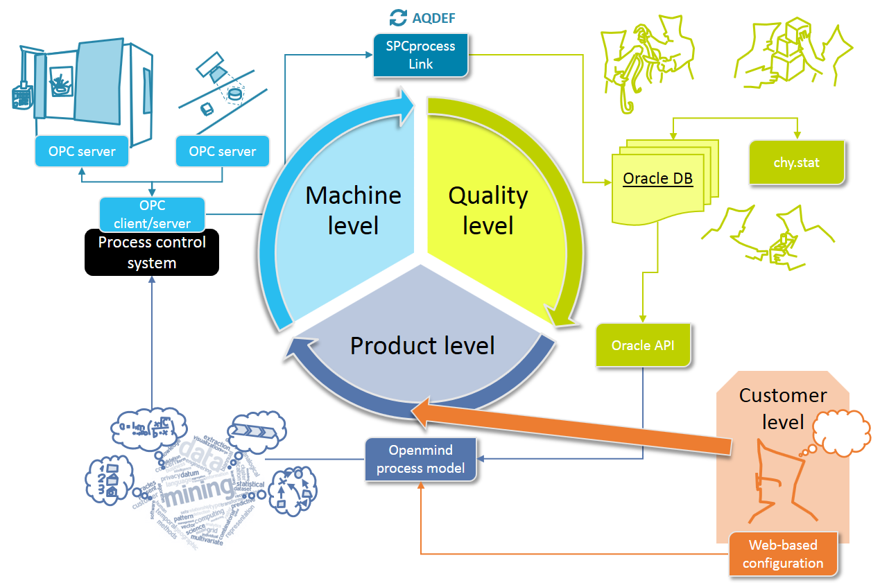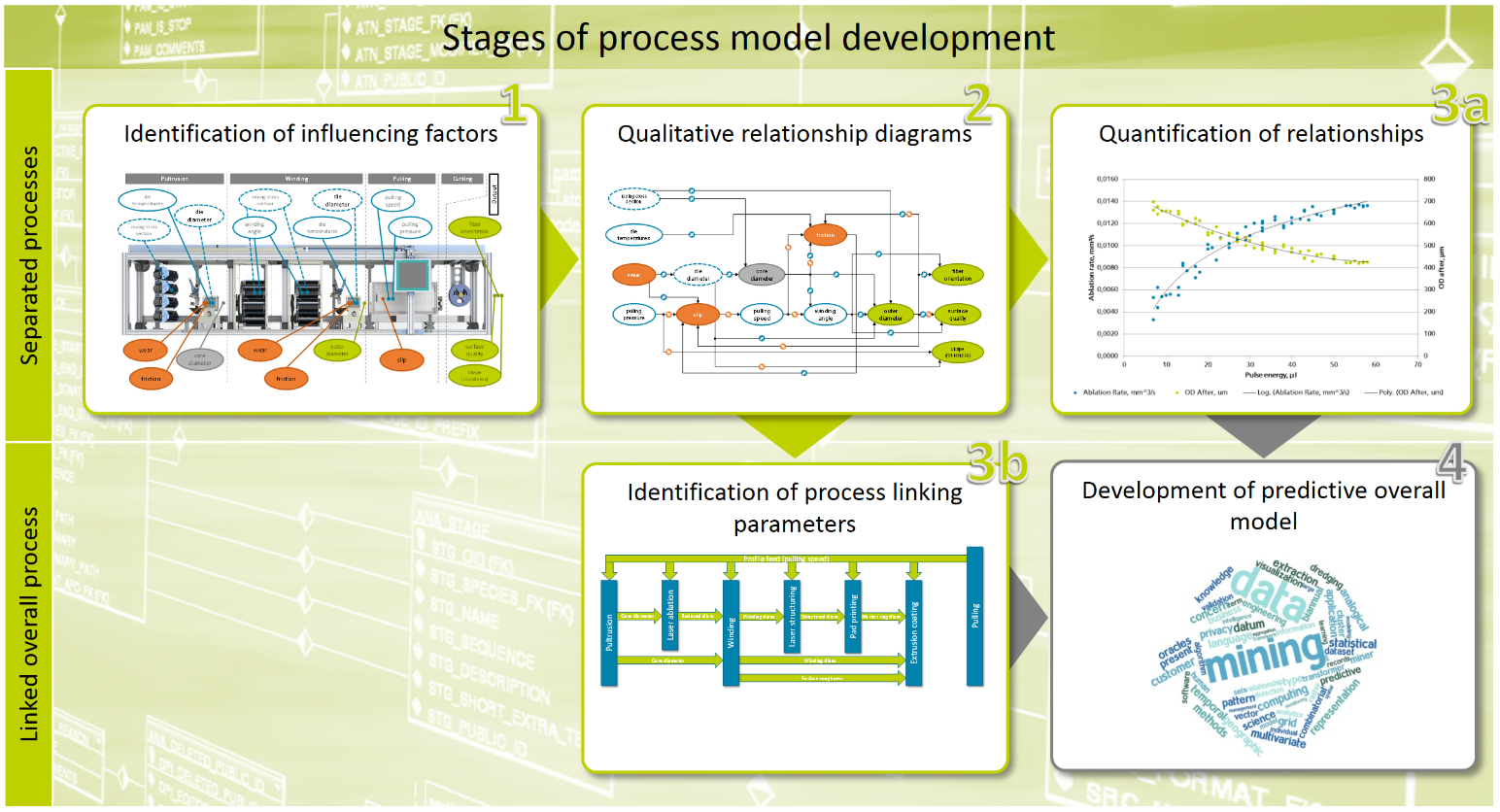 The consortium analysed all involved manufacturing processes and determined the most important influencing parameters for each process. The machine developers performed initial tests with existing manufacturing systems to quantify the contributions of these parameters to the outcome of each process and started to design new manufacturing systems and in-process inspection systems that are capable to process fibre reinforced micro profiles. In parallel, the software developers evaluated different approaches to translate the quantitative results of the tests into a machine learning model as digital representation of the real process. Finally, the whole consortium developed a future proof architecture to link all involved systems such as production hardware, inspection hardware, inspection software, databases and process models.