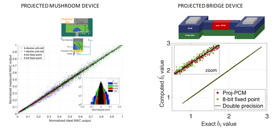 As part of this study, we explored various phase-change materials and projection materials. The most important invention in this front was that of single elemental phase-change materials. We showed how the simplest material imaginable, a single element (in this case, antimony), can become a valid alternative when confined in extremely small volumes. This work appeared on the cover of Nature Materials (August 2018 issue) [1]. We also developed the most comprehensive understanding of resistance drift in phase-change materials, the key attribute that we are trying to counter through the concept of projection. This work was published in Advanced Electronics Materials [2]. More recently, we could experimentally measure the onset of structural relaxation in the melt-quenched amorphous phase [3]. We also established a comprehensive understanding of projected phase change memory [4] and also demonstrated the ability to achieve 8-bit equivalent precision arithmetic operations [5]. The latter work was selected as a highlight paper at IEDM.
