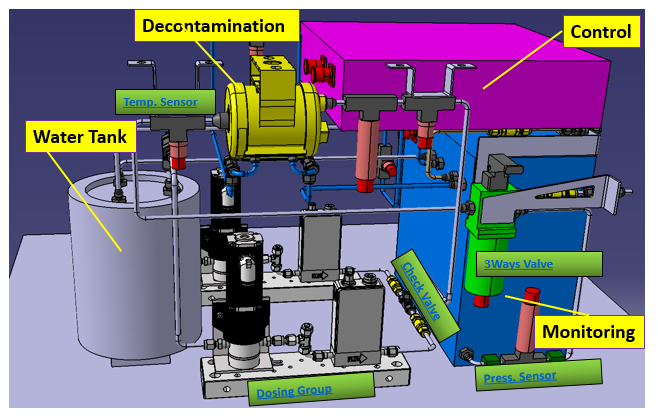 Objective 3: Building an integrated modular System, enabling biocontamination control of potable water systems (fully automated) and humid areas (semi-automated) in space and in the field.