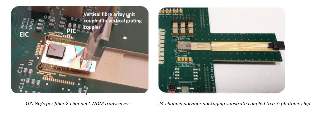 A major achievement was the development of a 2-channel CWDM silicon photonics transceiver packaged module at 100 Gb/s per fiber, consisting of a 3D assembly of a silicon photonic chip and its control electronic chip. The silicon photonic chip integrated high-performance 50 Gb/s NRZ optical modulators and photodetectors, a 2-channel CWDM multiplexer and demultiplexer and vertical grating couplers for in-and out-coupling to the fiber. The control electronics was optimized to minimize energy consumption down to 5.7 pJ/bit at 50 Gb/s data rate. This transceiver is salable to 400 Gb/s with 4 fibers in parallel.