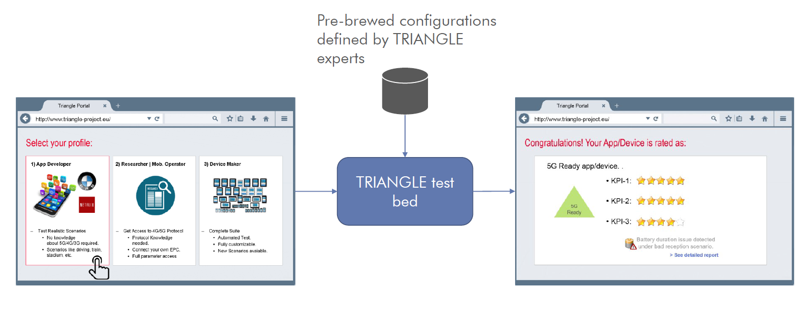 The TRIANGLE project is funded under the FIRE/FIRE+ objective, it started in January 2016, and had a duration of three years. The primary objective of the project is to promote the testing and benchmarking of mobile applications and devices in Europe as the industry moves towards 5G and to provide a pathway towards certification in order to support qualified apps and mobile developments using FIRE testbeds as testing framework available at the University of Màlaga.