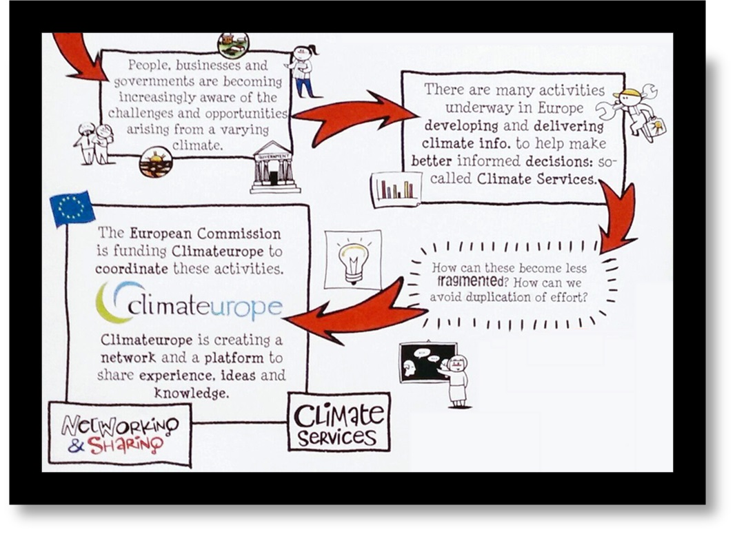 New communication channels are being explored. These include the use of Twitter (with over 700 followers), LinkedIn (with over 100 group members), and two webinar series, which have been archived as a series of videos through YouTube and the Climateurope website for those unable to participate live. The series of webinars were presented by a group of multi-disciplinary experts and have led to initial thoughts on gaps, challenges and emerging needs. A series of videos have been made from the first Festival. Colourful cartoon art has been used as a way of recording the main outcomes of the two Festivals. Climateurope’s social media accounts help promote the videos and other Climateurope activities including relevant news stories from the network members.