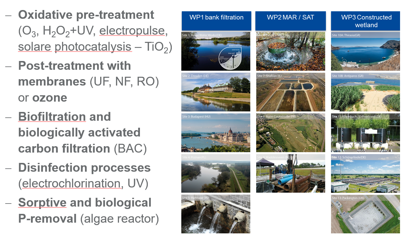 On OMP abatement, the oxidative processes were effective when treating surface water and WWTP effluent respectively before soil infiltration. In wastewater treatment, CW performed similar to technical filtration systems in post-treating ozonated effluent. Knowledge derived from these sites enabled the concerned utilities and companies