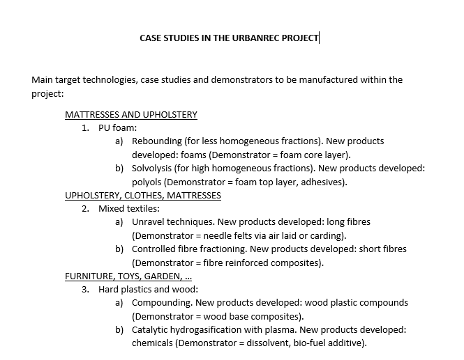 The URBANREC project objective were to develop and implement an eco-innovative and integral bulky waste management system (enhancing prevention and re-use, improving logistics and allowing new waste treatments to obtain high added value recycled products) and demonstrate its effectiveness in different regions. The valorisation routes considered in the project include: