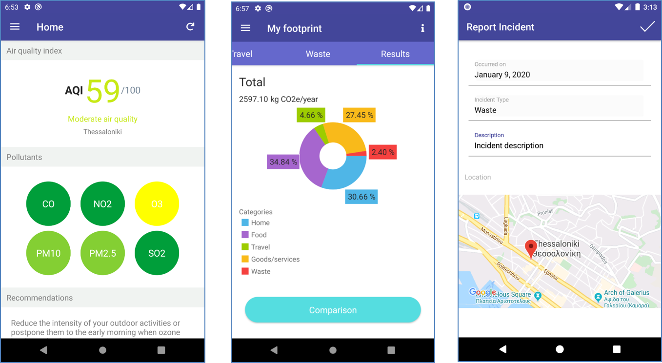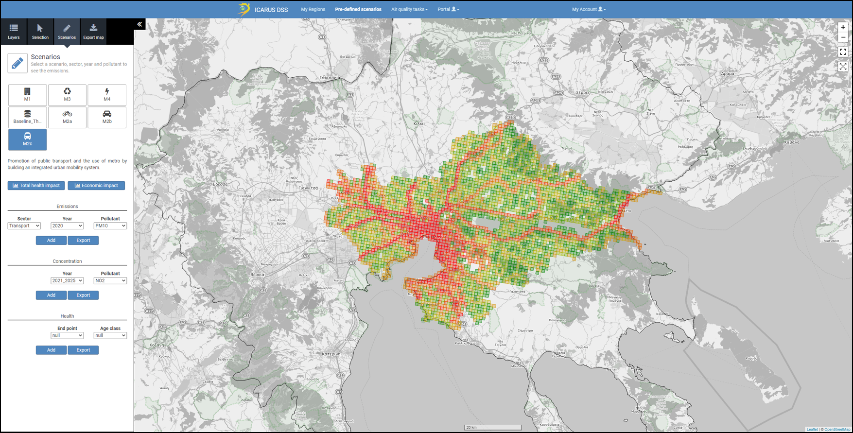 The ICARUS Decision Support System (Fig. 4) and mobile App (Fig. 5) have been developed and applied in the ICARUS cities. The DSS explores the impacts on air pollution, radiative forcing and public health of alternative urban interventions encompassing their total cost (both external and internal). The mobile App (available through Apple Store and Google Play) provides real-time information on ambient air levels and individual intake rates for key airborne pollutants, as well as a carbon footprint calculator aiming to modulate citizen behaviour towards more environment-friendly and sustainable urban lifestyle.